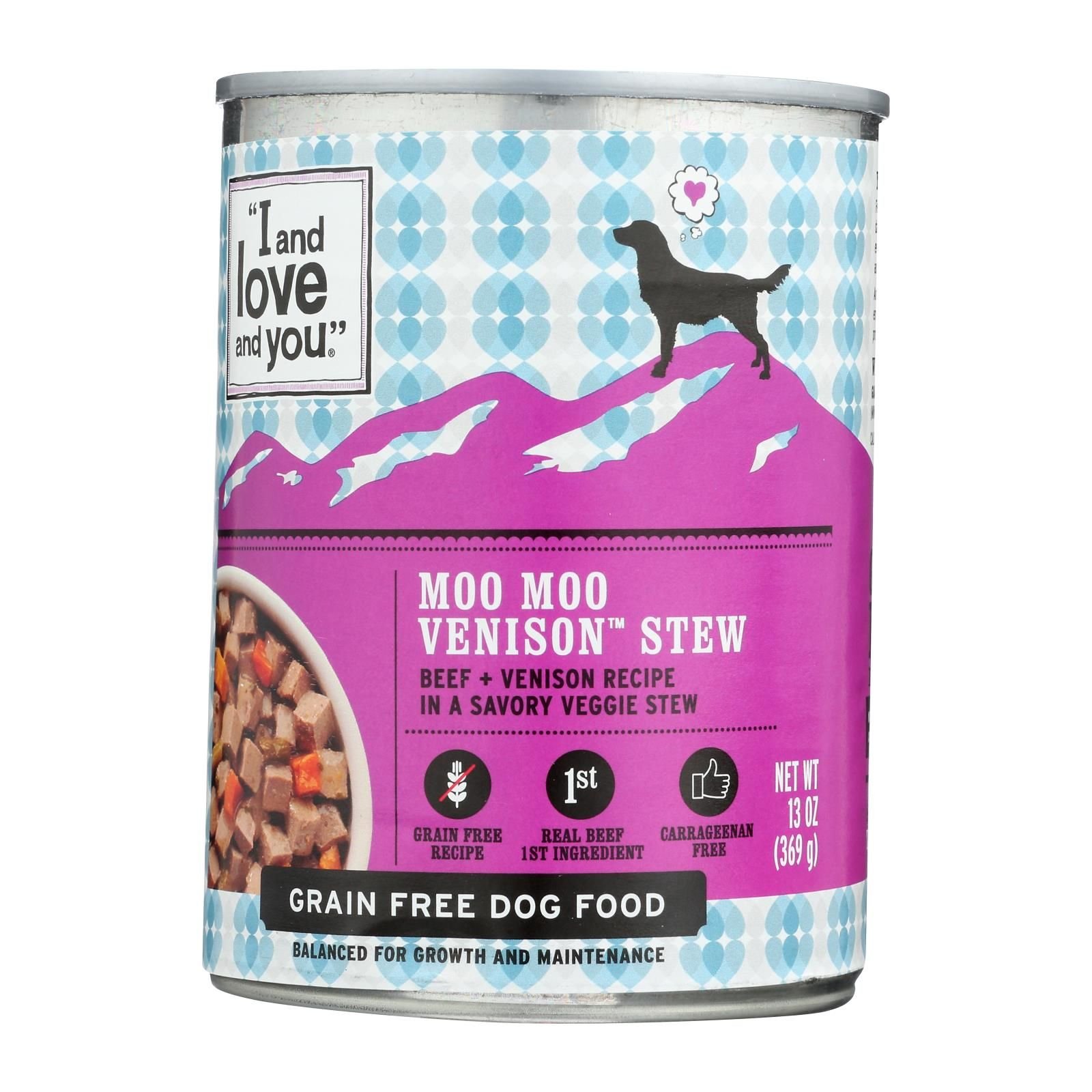 12x Moo Moo Venison Stew Wet Adult Dog Food from I and love and you is a grain-free, balanced formula for growth and maintenance. Made with beef and venison morsels in a savory veggie stew, this dog food is free from artificial colors, flavors, and preservatives.
