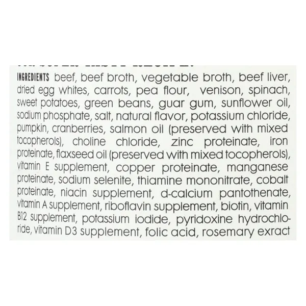 Ingredients: beef; beef broth; vegetable broth; beef liver; dried egg whites; carrots; cranberries; venison; dried peas; spinach; sweet potatoes; green beans; guar gum; tricalcium phosophate; sunflower oil; sodium phosphate; salt; calcium carbonate; natural flavor; potassium chloride; salmon oil; preserved with mixed tocopherols; pumpkin; choline chloride; zinc proteinate; iron proteinate; flaxseed oil; vitamin e supplement; copper proteinate; manganese proteinate; sodium selenite; thiamine mononitrate; cobalt proteinate; niacin supplement