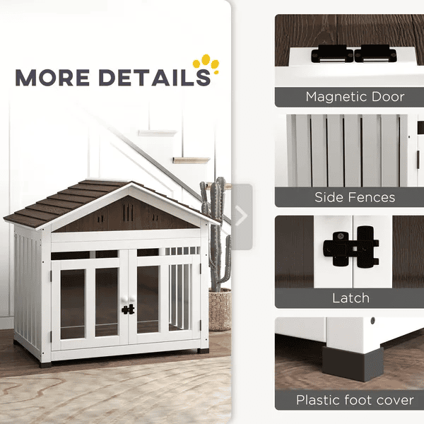 Secure and Ventilated: Features a magnetic door design with a latch. The side fences for secure and breathable surroundings, ensuring your pet feels safe and comfortable in this dog house