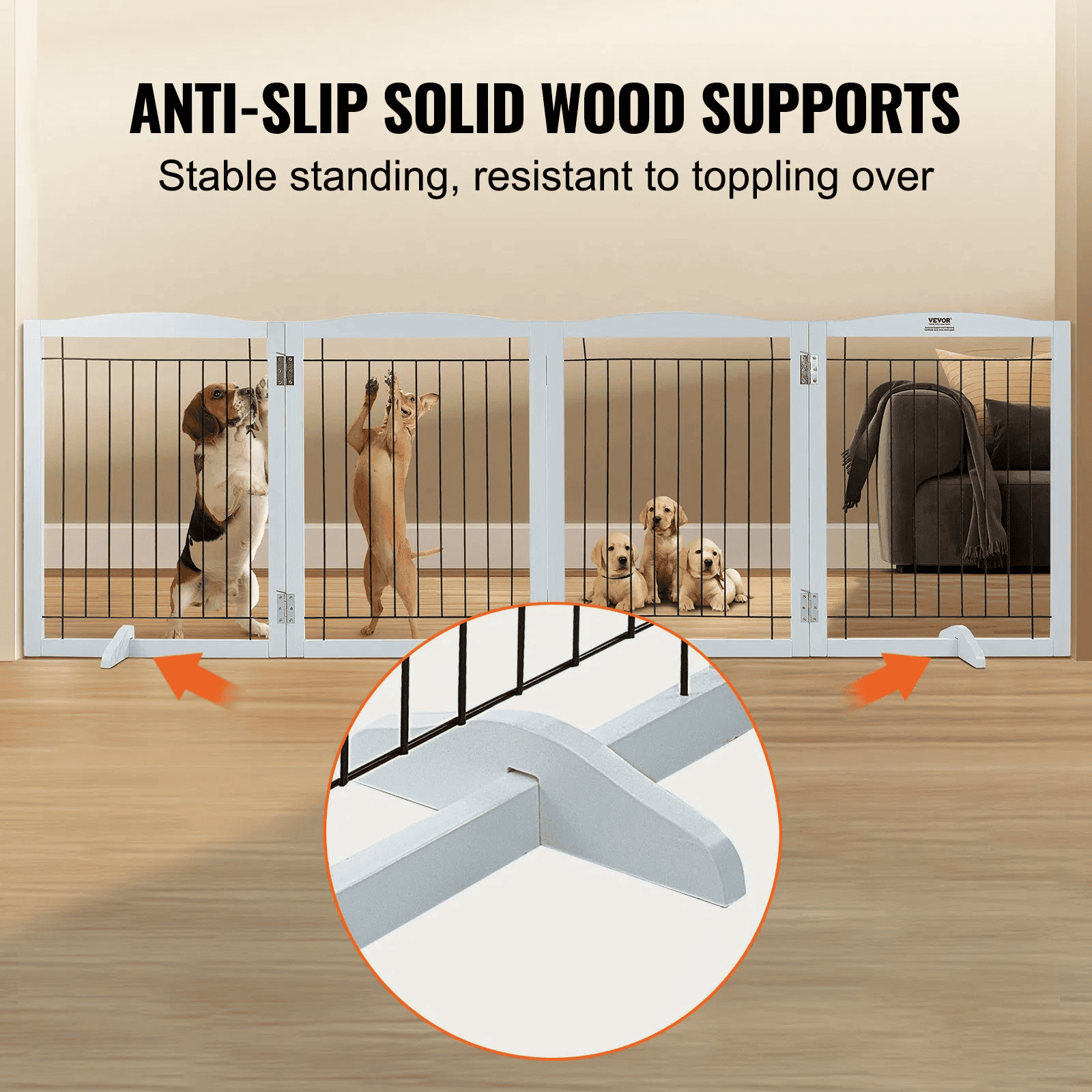 Our wooden dog gate is equipped with two anti-slip foot supports. It maintains stability in all standing positions, preventing any risk of toppling over and safeguarding your home. Plus, the addition of silent foot pads provides floor protection and ensures noise-free movement.