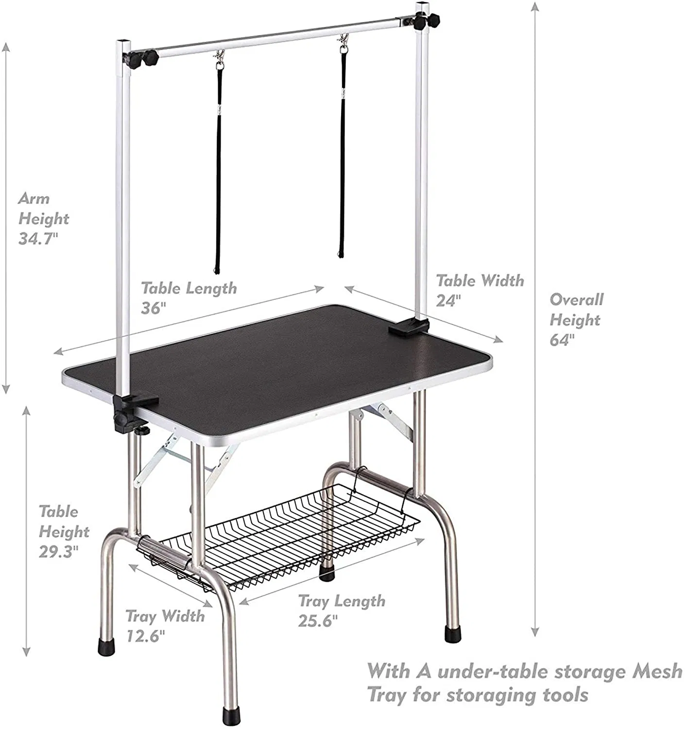 Solid and Durable Grooming Table: The Pet Grooming Table is made of a stainless steel frame, MDF board, and PVC feet pad.