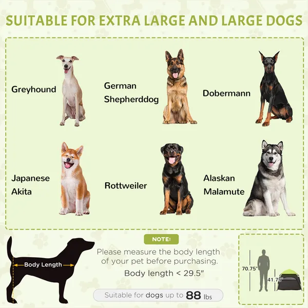 Spacious Pet Tent: With interior dimensions of 43.25"" L x 43.25"" W x 33.5"" H, our pet tent is suitable for extra large and large dogs less than 29.5"" in length and less than 88 lbs. in weight.