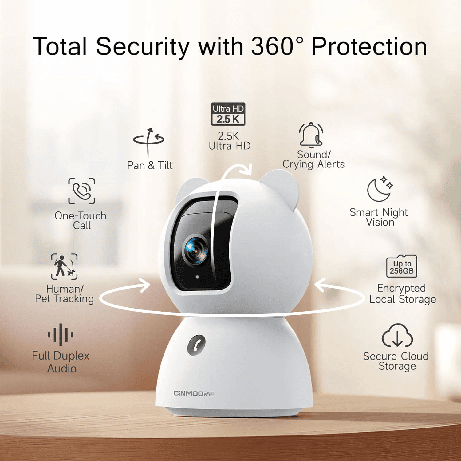 The camera supports 360° pan and 90° tilt movement, ensuring full coverage of your home with no blind spots.