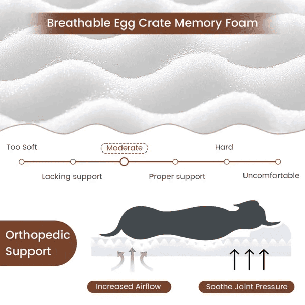 Superior Memory Foam Support: Made of 35D high-density memory foam, the dog bed gently supports your dog's body, which is conducive to relieving back pain. And multiple ventilation holes are scattered throughout the foam for excellent air circulation, creating a breathable experience.