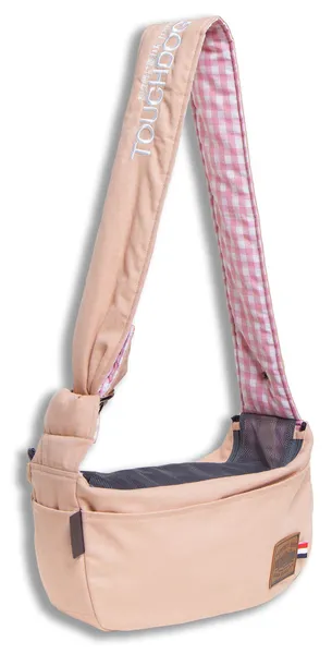The Over-The-Shoulder Hands-Free Dog Travel Slings features a trendy Over-the-shoulder strap that is reverse stitched with an accented handkerchief plaided print.